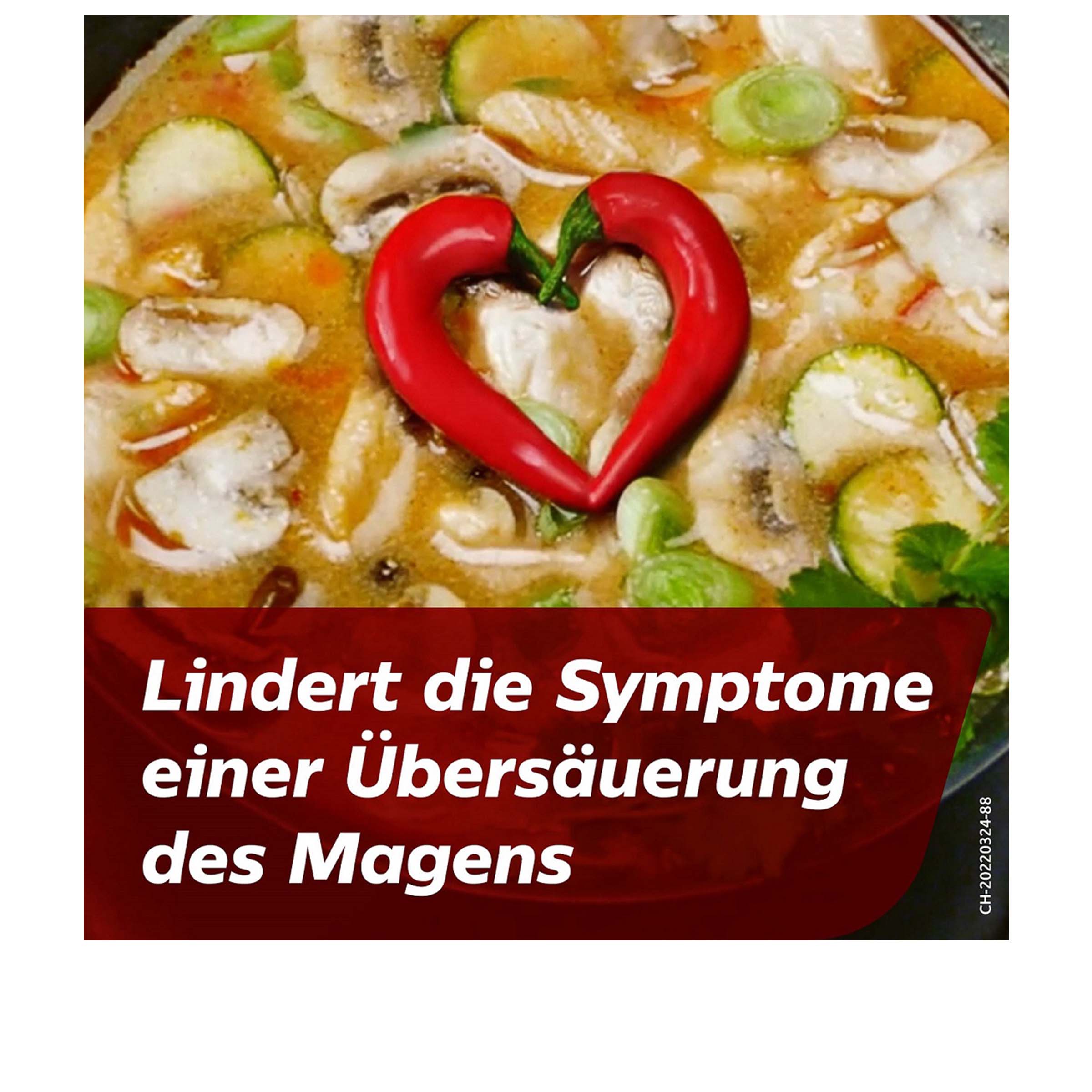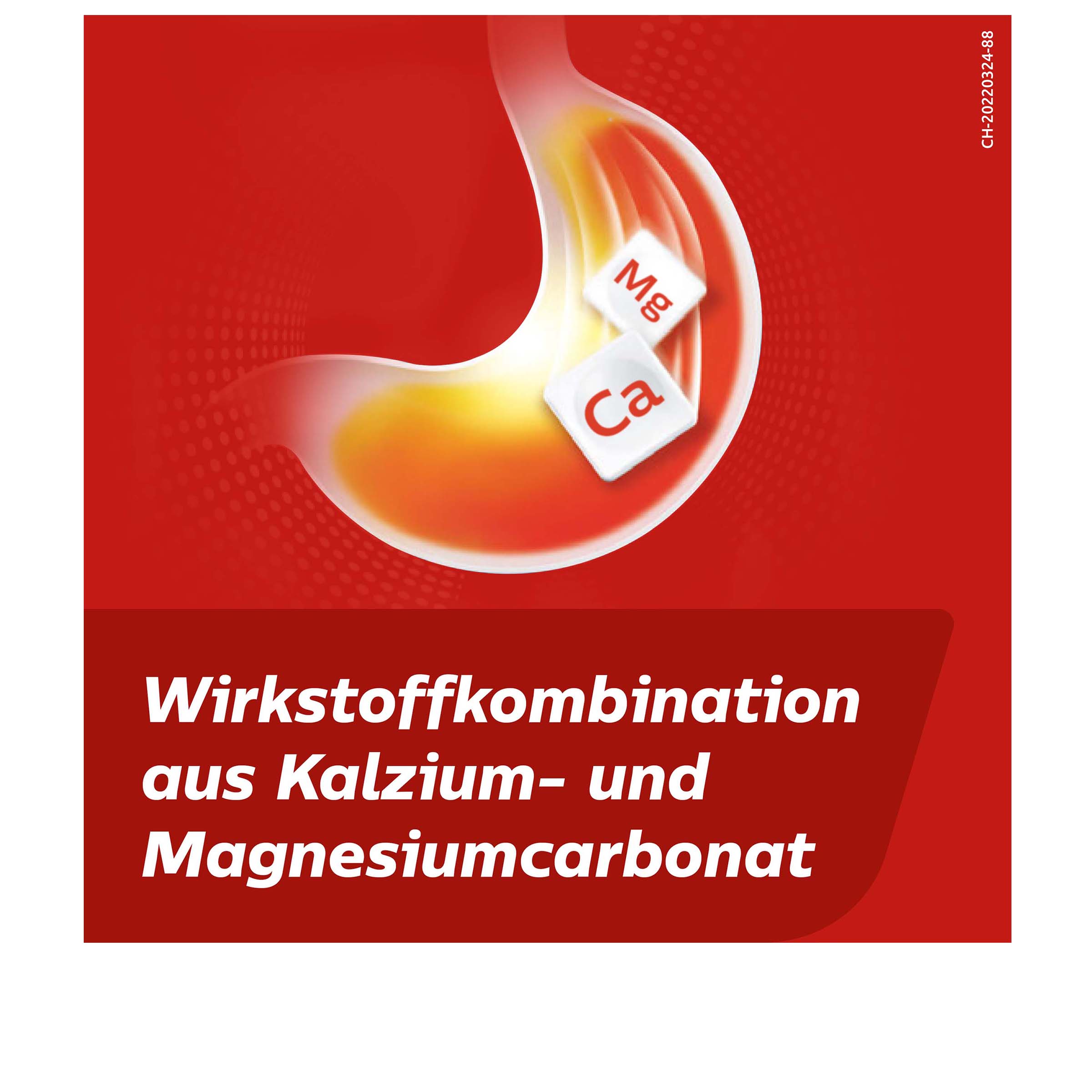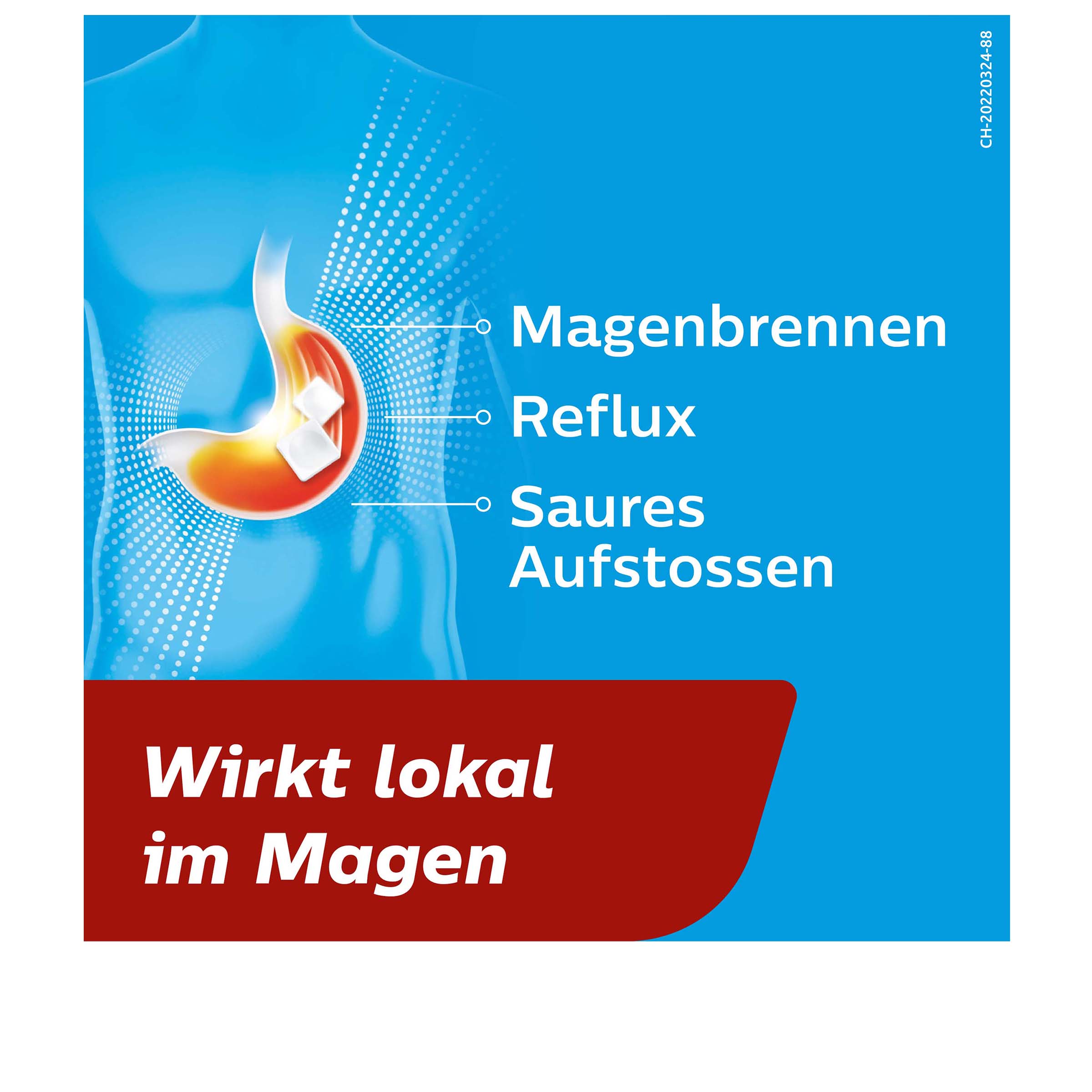 - 1-2 Lutschtabletten als Einzeldosis, Einnahme vorzugsweise eine Stunde nach Mahlzeiten und vor dem Zubettgehen, jedoch bei Sodbrennen auch zwischendurch. Die Tageshöchstdosis von 11 Lutschtabletten sollte nicht überschritten werden.
