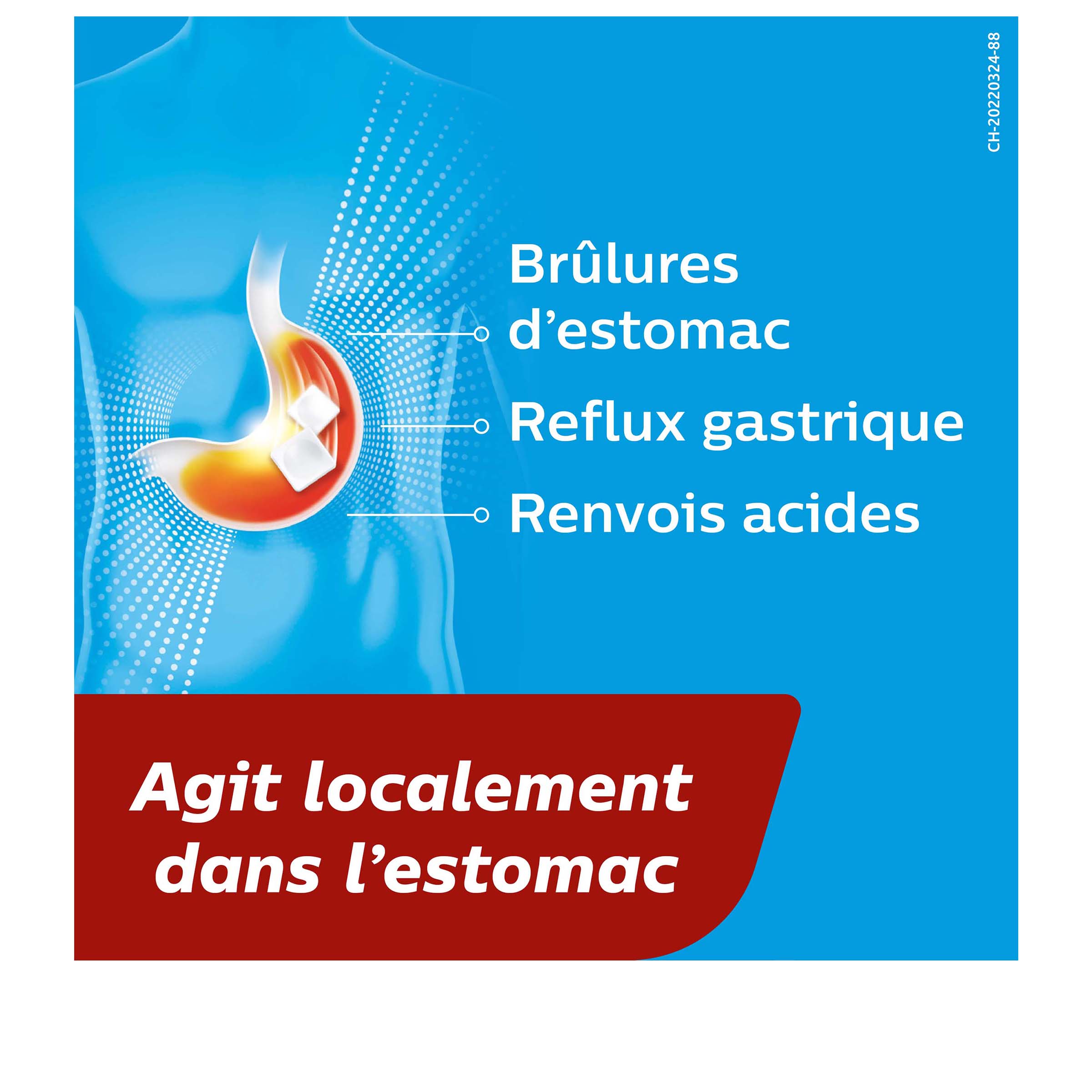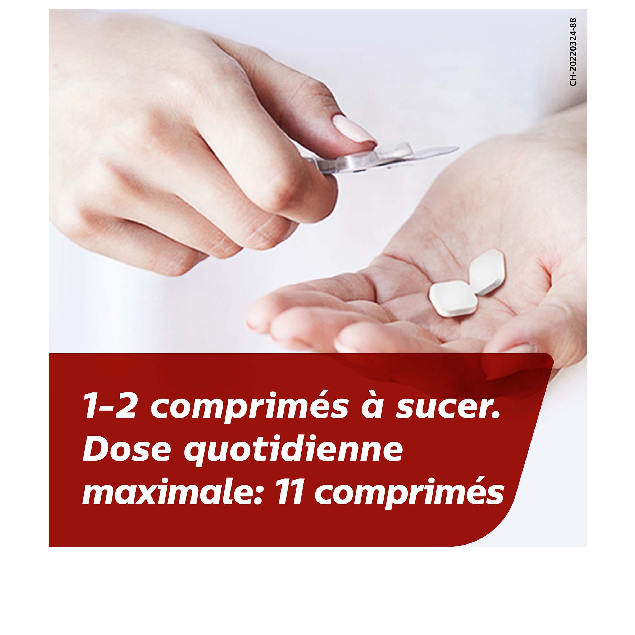 - 1 à 2 comprimés à sucer en dose unique, de préférence une heure après les repas et avant le coucher, également entre-temps en cas de brûlures d’estomac. Ne pas dépasser la dose journalière maximale de 11 comprimés à sucer.