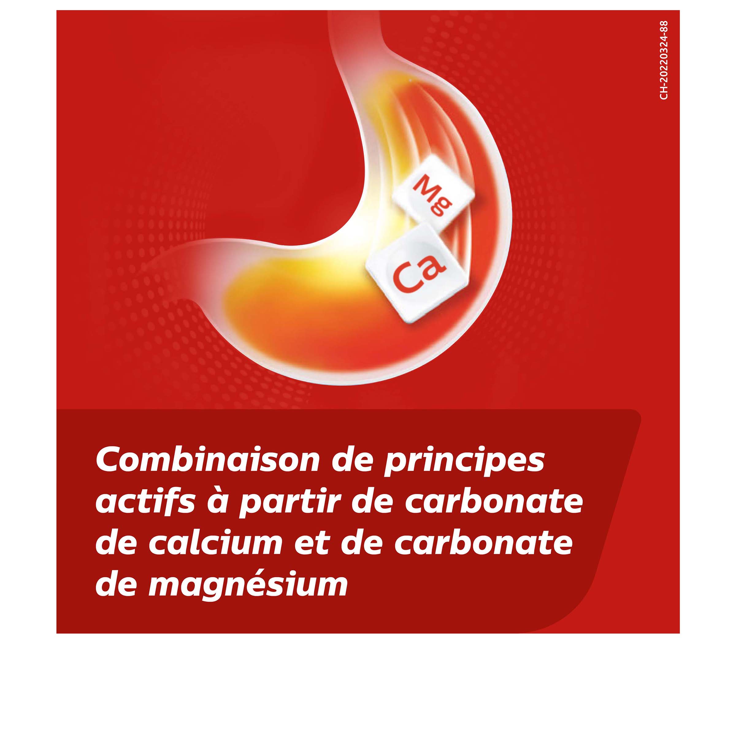 Grâce à son association de principes actifs, le carbonate de calcium et le carbonate de magnésium, Rennie® Peppermint neutralise l’acide gastrique et soulage les symptômes liés à une hyperacidité de l’estomac tels que brûlures d’estomac et remontées acides.